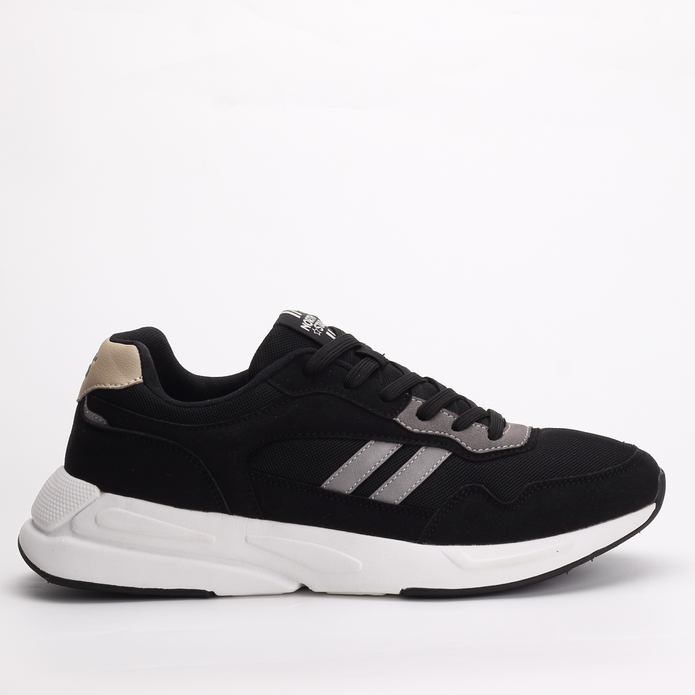 The North Star Unisex Lace-Up Sneakers in Black With White Stripes deliver a clean, classic look paired with everyday comfort for both men and women. Crafted with a breathable textile and synthetic upper in timeless black, the contrasting white stripes add a sporty, street-ready edge. The lace-up closure ensures a secure and adjustable fit, while the cushioned comfort insole supports all-day wear. Finished with a flexible rubber outsole for reliable traction, these sneakers are ideal for casual outings, daily errands, travel, and relaxed weekends.